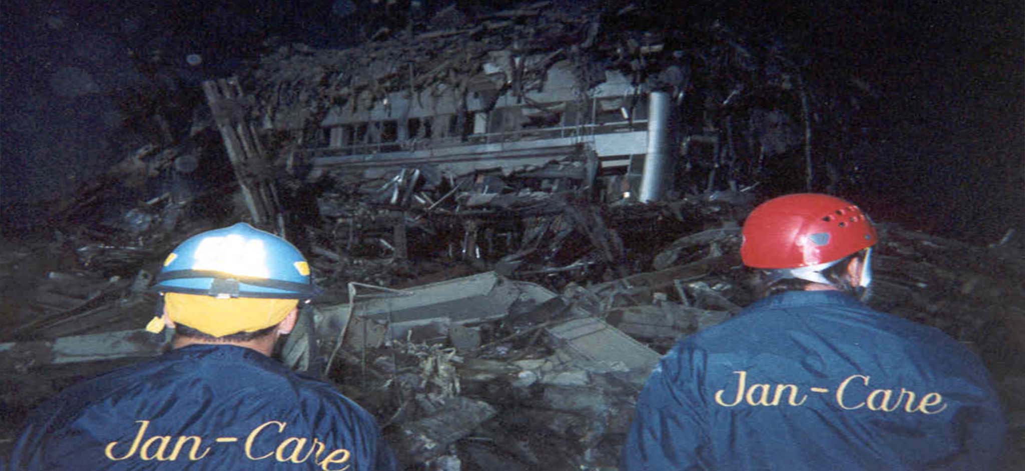 The Jan-Care team joined other response teams from across the region in an organized and methodical search and rescue operation. After an extended deployment and at a period of near exhaustion the team was commissioned a break and self-staged back at Battery Park in lower Manhattan, sleeping on park benches for a few hours and then returning to the site of mass destruction.